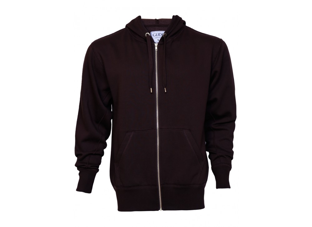 80/20 ring spun cotton/polyester Fleece , 9 oz / 300 GSM , Two piece Hood with DTM draw cord metal tipping , YKK Brass metal zipper , Antique nickel eyelets , 1x1 spandex rib at cuff and bottom , Self fabric panels at sleeve and side body
