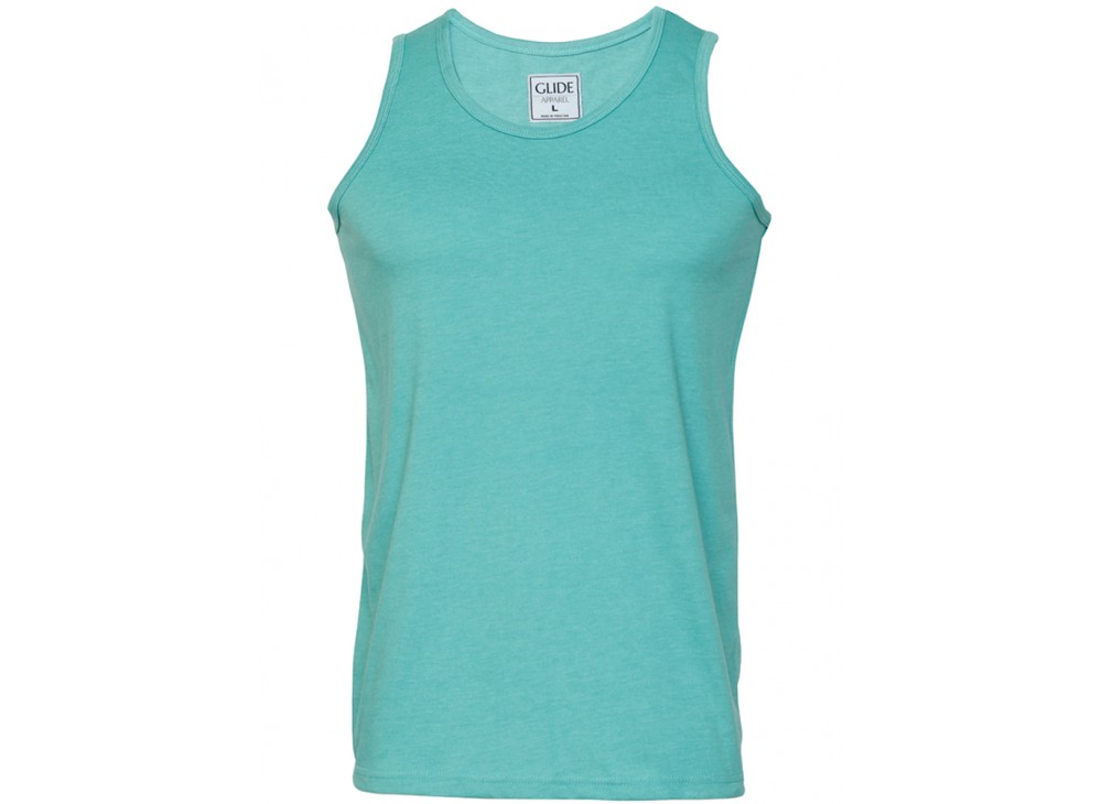 50% polyester/37% cotton/ 13% Rayon Triblend Jersey , 4.5 oz / 150 GSM , 1x1 spandex rib at neck and armhole , Two needle hemed at bottom.
